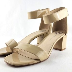 Excellent pre-owned like-new condition, The Wishbone Collection ADDISON 2 in a nude patent leather, practical subtle velcro ankle strap with block heel and square toe, size 11M.