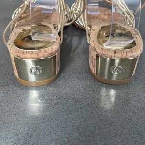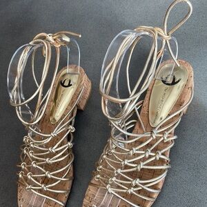 In good second hand condition gently worn. Pretty gold strappy knots details with a wrapped around the ankle lace. The lace have started to open but still have left. Cork bottom. Heel height: 1,5''. Sold as it.
