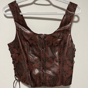 It's time to face your destiny. From The Witcher, this faux leather bustier is inspired by Ciri. It has a cropped fit and features allover filigree designs along with her swallow symbol. Comes with lace-up detailing on the sides and a back zipper closure. Brand is Hot Topic.