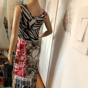 Long maxi dress sleeveless with barcode. Open at the bottom on the left side.