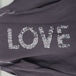 This sweatshirt is in very good used condition, "Love" spelled out with sequins. Cold shoulder top. Elasticized cuffs