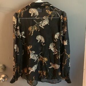 Stylish black top featuring a bold animal print design. Perfect for adding a touch of wild elegance to your wardrobe.