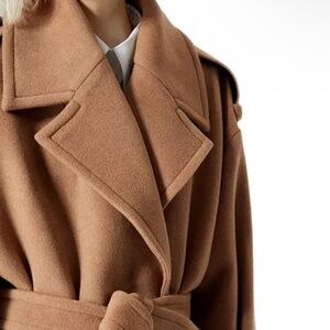 Designed for a roomy fit, this wool blend coat features a notched collar, epaulets, long batwing sleeves, tab detail at cuffs, front button closures, self it belt and 2 fold over pockets at sides.