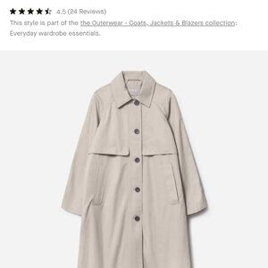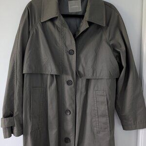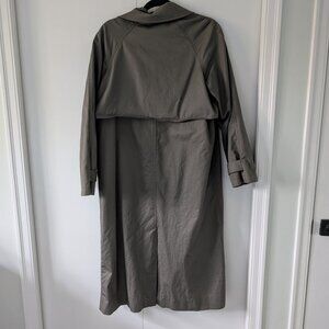 The long Mac coat in an olive green color (called pewter). Size XS but it is an oversized trench coat. Good used condition. One small, barely noticeable mark on sleeve.