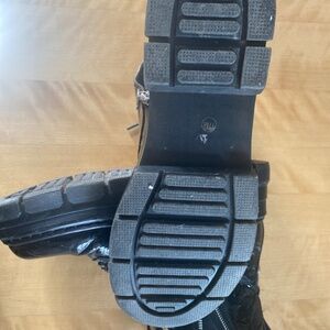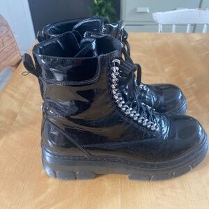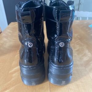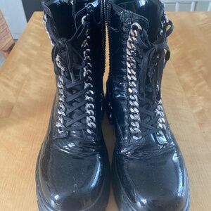 Beautiful pre owned shiny black shoe size 11 with some creak made by movement. They are quit heavy and a very good quality. This boots is a size 11 but fit more like 9-10.