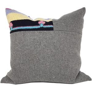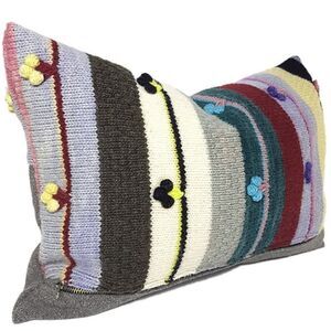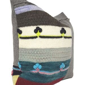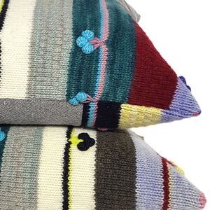 Hand knitted wool stripe pattern in a colorway of Cream, Grey, Teal, Lavender, Olive Green, Burgundy and Dijon with minor accents of Lemon/Lime, Black and Peacock Blue. The addition of little cherry like bobbles in complimentary tones adds a unique fun twist. Backing is made from a hand-loomed Wool Tweed in an Olive tone to compliment. There are two different sizes pictured here. Price is for one of them, drop me a note when purchasing as to which size you would prefer.