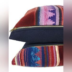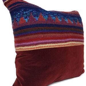 This hand woven striped wool throw pillow comes from a hand-loomed wall hanging. There are two in the series. They both are made from the same textiles, although are put together a wee bit differently. On one the stripe pattern is centered on the other it’s offset. Colorway is predominately a deep burgundy red with accents of blue, lavender and cream. Backing is constructed from a navy-blue Wool Melton.