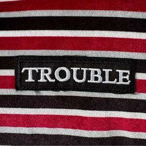 Edgy and eye-catching striped mock neck top from The Ragged Priest. Features bold red, black, and silver stripes in a soft velvet-like fabric with a stretch fit. “TROUBLE” patch embroidered on the chest adds a statement detail. The material is velvety soft!