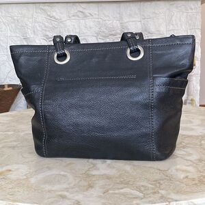 Gorgeous buttery soft black leather tote bag from The Sak. In excellent preowned condition, it features long dual carry straps that can go over the shoulder, two exterior side pockets as well as exterior slip pocket, perfect for cell phone.