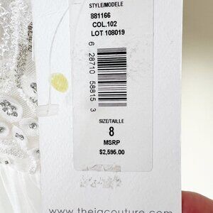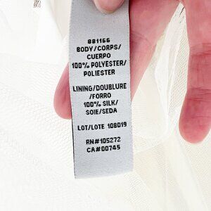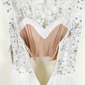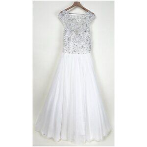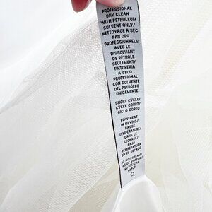 Elegant Theia wedding dress. Features delicate lace bodice. Flowy tulle skirt. Perfect for a timeless bridal look.