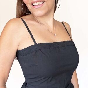 Theory Black Spaghetti Strap Midi Dress. Gorgeous minimalist style dress in a midi length for a flattering fitted silhouette. Features a square elasticated neckline, fitted bust, adjustable / removable slim straps, side in-seam pockets and back zip closure details.