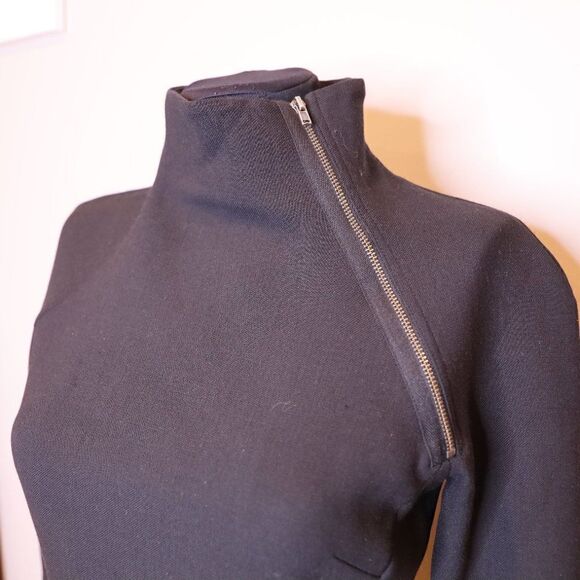 Black fitted virgin wool Danella sheath dress from Theory. Features asymmetric zip at collar and a high neck. Can be unzipped or zipped up depending on your preference. Side zip closure.
