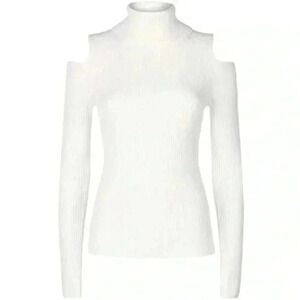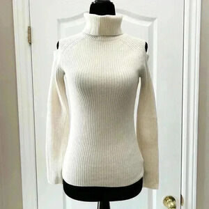 Theory Jemliss Cold Shoulder Ribbed Wool Turtleneck Sweater Ivory Cream Small