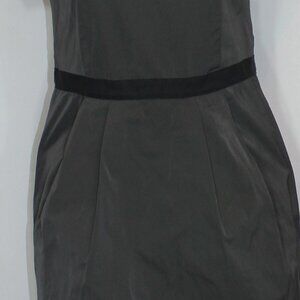 Dark grey color with black grosgrain ribbon trim. it’s lovely and perfect as a career style or dressed up for a cocktail event. The skirt and front of the bodice are a satin taffeta and the sleeves/back of bodice are a softer cotton-like knit. Measures 35” shoulder to hem, waist 16” flat, bust 18”. Exposed back zip. Two hidden front pockets. Pre-owned in good condition