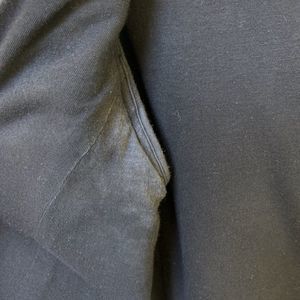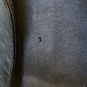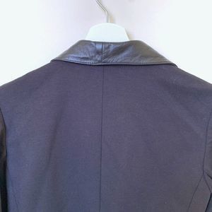 Condition: GUC, two flaws that are invisible when blazer is worn. Small hole in cotton lining. Fading on interior armpits from deodorant/cleaning solution to remove deodorant. Leather and jersey exterior are in excellent condition.
