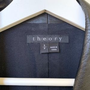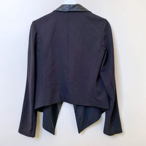 Luxurious sheep leather provides an edgy, hard look into an open front jersey blazer. Dressy enough for the office but fun enough for a night out.