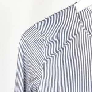 The Lexanda top from Theory is made with a cotton poplin in the blue and white striped Mason variant, and features long sleeves with elongated flared cuffs, a round neckline with a button-fastening keyhole at the rear, and a boxy peplum hem with side slits.