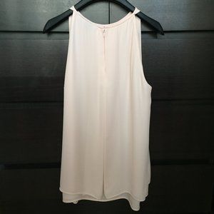 Sleeveless, drapey blouse in blush pink 100% silk georgette fabric with a layered arched hem, back zipper, pleated back for fluttering movement, and loose flowy fit