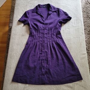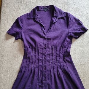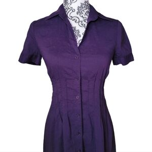 Deep purple fit and flare button up dress with pintuck detail around the waist, short sleeves, v-neck opening with single button at the neck. In very good used condition
