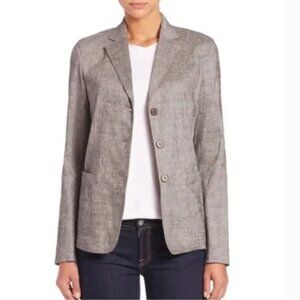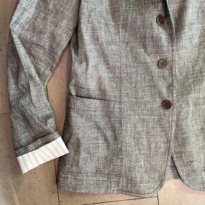 Selling a Theory Minou T Linen Blend Blazer, Sharkskin Crunch, Black and Ivory-Size 2. Bought it but never wore it. Push-up sleeves and a relaxed fit. Like new. Notched lapel. 3-button closure.Patch hip pockets. Contrast striped lining in sleeve. 63% linen/35% viscose/2% elastane.Color: Black/Ivory