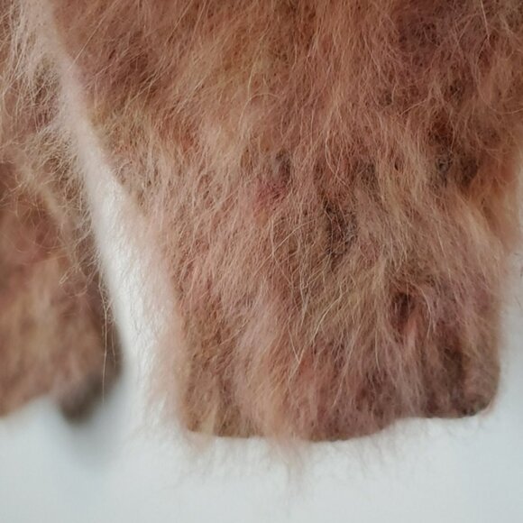 This angora cardigan features an open placket and ribbed edges. Patch pockets at hip. Long sleeves.