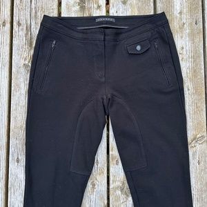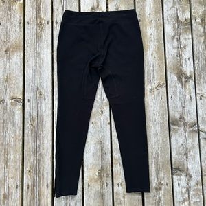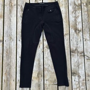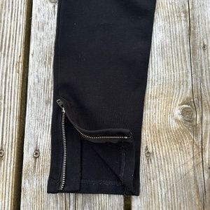 Theory black skinny pant. Low / mid-rise. Moto style. Side zip pockets and zippered ankles. Zip and hook and bar closure. Thick stretch fabric; 71% viscose, 23% polyamide, 6% elastane. Dry clean only. Size 4 estimated, see measurements.