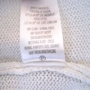 Theory V-neck chunky knit sweater. Color: Ivory. SIZE: S. Knit pull-over is designed with a v-neck. Crafted from a linen/polyamide blend in a chainette construction. Sweater is finished with drop shoulders and ribbed trim. Fitted Sleeves. Fabric Content: 54% Linen, 46% Polyamide. The sweater is in very good pre-owned condition. Minor overall wear. No stains, rips or discolouration. Note: The slubs on the fabric are not considered flaws as they are part of the natural characteristics of the yarn.