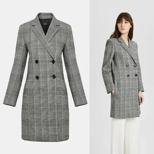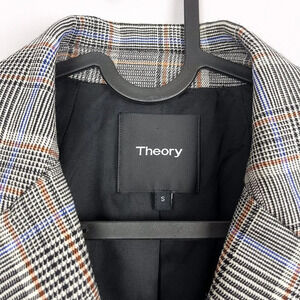 Embrace timeless elegance with this Theory double-breasted coat, tailored in a classic plaid pattern featuring hues of blue, brown, and grey. Crafted from a premium wool blend, this size small coat offers both warmth and style. Its structured silhouette and notched collar add a sophisticated touch, making it a versatile addition to any wardrobe. Gently worn and in excellent condition, this piece is perfect for elevating your fall and winter ensembles.