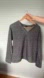 DESCRIPTION: Classic Casual Beautifully crafted V neck sweater from Theory. Soft Cotton Wool Blend. Long Sleeves. Wide hem line and cuffs. Knit has a vertical stripe mixed with a herringbone pattern. Not a solid color. Grey and black blend.