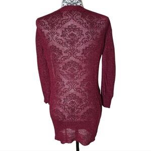 Wine colored lightweight wrap sweater. In good used condition, a couple of snags have been pulled through as pictured, material tag has been cut out.