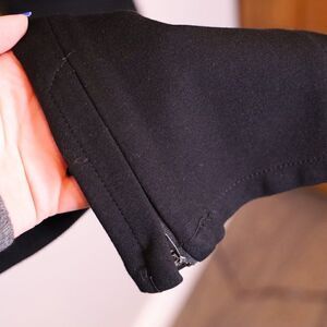 Black stretch Theory slim dress pants. Riding pant style with accents at knees.