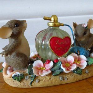 In perfect condition This Charming tails I'm under your spell ornament is very cute. Two mischievous mice trying on perfume. This Charming tails was created by artist Dean Griff. And was made for Fitz and Floyd Incorporated. In Perfect condition no cracks chips or Nicks. This figurine is 12 cm Long and 5.5 cm tall.