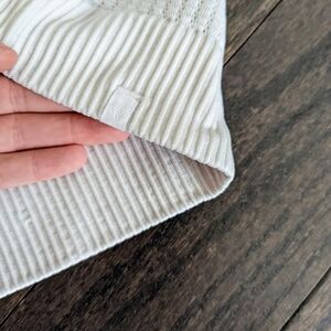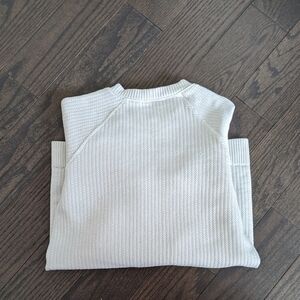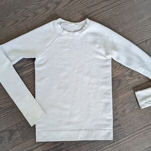 Off white Lululemon thick long sleeve with texture on the inside and outside and thick band around the waistband and cuffs. It is in good used condition with marks and discoloration around the cuffs but still has life left!