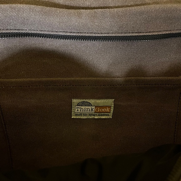 So how does this apply to us and ThinkGeek? Well their version of the Bag of Holding looks similar to that of a messenger bag. Wait a minute… upon closer inspection, it would appear that… yes… yes it is a messenger bag! And this bag can be used upon your daily travels... holding many things. On the outset, the bag is made up of a rugged, yet soft canvas material, with a nylon adjustable strap. The top part of the bag is locked into place with a magnetic snap; at the top is a zippered pouch (with no additional pockets). This main flap opens up to reveal three additional pouches; the first is held by magnetic snap and the second and third are zippered. The first and third pouch contain smaller pockets for holding miniscule objects (gotta have a place for your d20 dice). At the top of the bag, just behind the handle, there's another padded compartment that can be used to hold documents, books, laptop, tablet, anything. And finally at the back there is one more pouch with a magnetic snap.