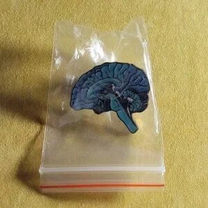 Anatomical style brain enamel lapel pin featuring the word Think and a hidden bird. Soft rubber pinback. NWT.