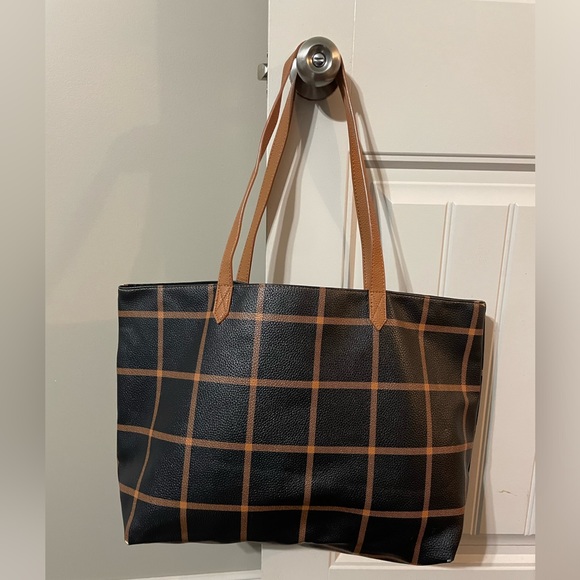 Windowpane plaid in black and camel. Very good condition with slight wear at seam corners. Great work bag for laptop etc. One exterior cell phone pocket. Two interior pockets and one zip interior pocket.