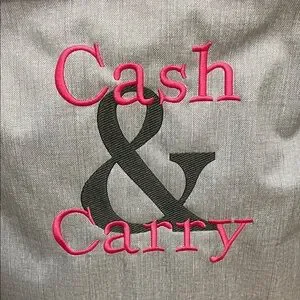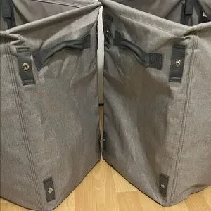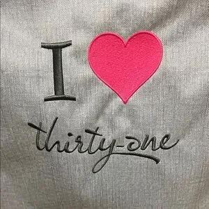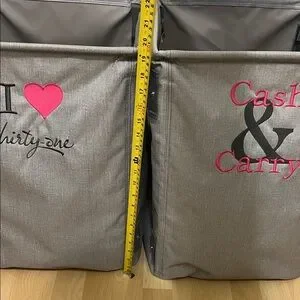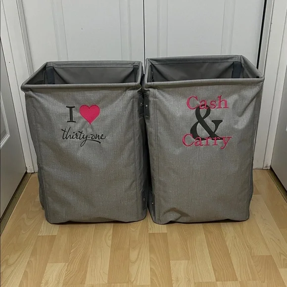Pair of gray storage bins. Features 'I heart thirty-one' and 'Cash & Carry' in pink. Great used condition. I used these to store my on hand stock at vendor events & trade shows.
