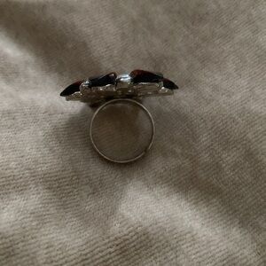 ✅This & That Floral ring, brown black lucite laminated petals, zircon stones.