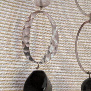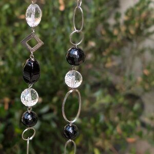 The necklace can dress up a formal outfit or bring a sparkle to a more casual outfit . A combination of black and clear glass beads, some faceted and some smooth, in various shapes and sizes, including pounded and smooth metals.