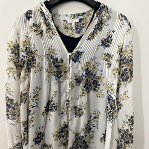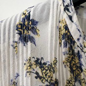 This soft silky blouse from Joie is beautifully pleated and draped, with a floral pattern. The buttonholes are fabric loops and the buttons are fabric-covered. The blouse is approximately at US 6 in size. The photos show the beautiful pleating and stitching that makes the blouse drape so well when worn. The final photo shows the careful inside stitching with covered seams.