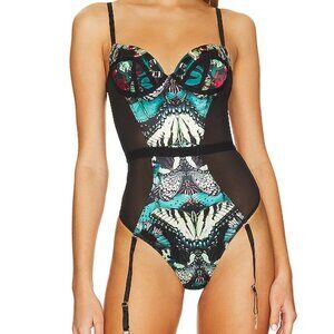 Thistle and Spire Menagerie butterfly patterned bodysuit. Patterned with sheer black panels on the sides and a sheer back including a thong bottom. Garters are attached to the suit. It's New With Tags in size XS (see size chart for more detail).