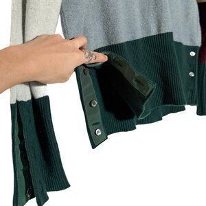 Colourblock design featuring blue, burgundy, green, and grey tones soft cashmere. Designed with a spread collar, button placket, ribbed hem, and cuffs with buttoned side vents. Tonal green grosgrain trims at cuffs and side plackets. Signature four-bar stripes detail at the sleeve. Finished with Thom Browne’s tricolour grosgrain loop tab at back neck. Made in Scotland.