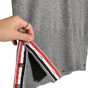 Soft cashmere with a fine knit texture. Features a button-up front closure, polo collar, and ribbed hem. Signature four-bar intarsia in ivory at left sleeve. Side button plackets revealing red, white, and navy grosgrain trim. Back neckline accented with Thom Browne’s tricolour loop tab. Made in Scotland. Comes with original tag attached.