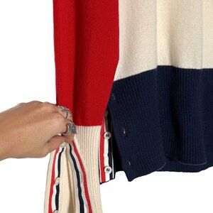Pure cashmere. Ivory body with navy ribbed crewneck. Colourblock effect. Red right sleeve and navy left sleeve with Thom Browne’s signature four-bar stripes. Navy wide ribbed hem with functional side button plackets. Extended ribbed cuffs at sleeves with functional button plackets. Grosgrain tricolour loop tab at back neck and at plackets trims. Made in Scotland.