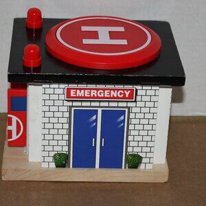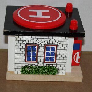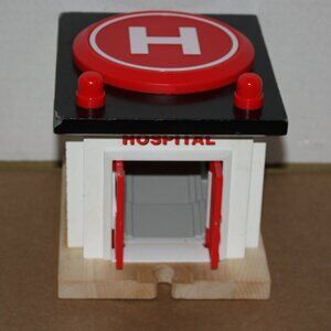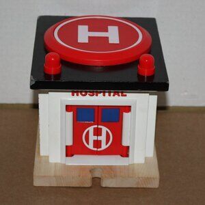 2002 Thomas Wooden Railway Rescue Hospital with drive-up track piece included. This piece does NOT come with Harold the Helicopter that lands on the top landing pad. When red pad on the top of hospital is pushed down, emergency doors open for a car to enter. On the wood in front of the doors there is some green from crayons marked on it. (It may or may not come off with cleaning). It is in good, used condition, with mild play and some wear to paint on edges of building. It is sold 'as is' with no refunds.