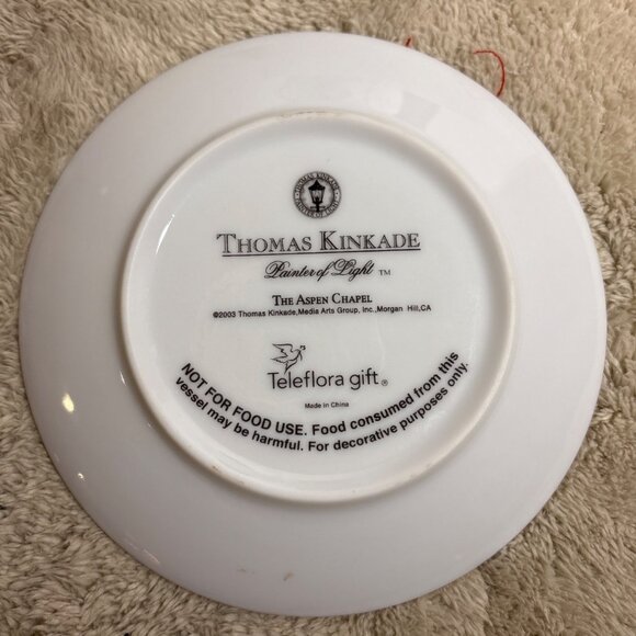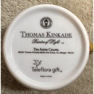 This Thomas Kinkade cup and plate set features "The Aspen Chapel" design. With gold accents and vibrant artwork, it’s ideal for decorative display.