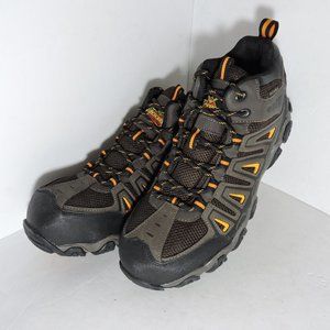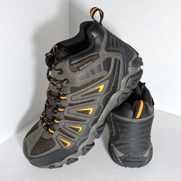 Sturdy, waterproof security boots with a steel toe tip and a slip-resistant rubber sole.