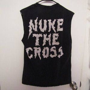 Thrash metal Toxic Holocaust T shirt with the sleeves cut off that reads ''Nuke the Cross'' on the back