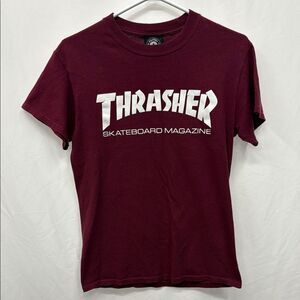 Burgundy Thrasher tee featuring a striking white logo. Ideal for skate fans.