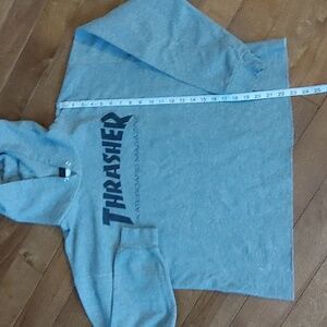 Oversized? Cropped? Raw Hem Thrasher Hoodie fair condition has minimal wash wear and some holes see pictures. Distressed. New to poshmark? Sign up with my code Jstewart261 to receive $15 off your first purchase.